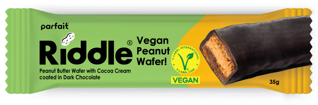 Prémium étcsokoládéval bevont, lágy mogyoróvajjal töltött vegán ostyás szelet bársonyos kakaókrémmel.