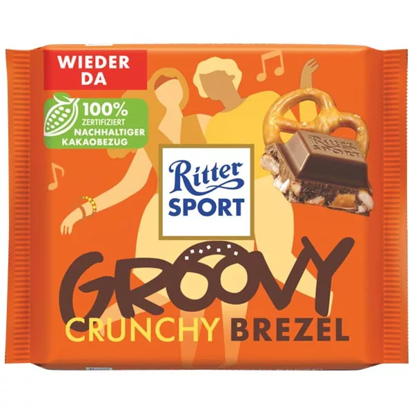 A Ritter Sport Bretzel egy 100 g-os tejszínű tejcsokoládé-alkotás, amelybe sós perec darabkák kerültek. A minőségi összetevőkből készített barátbarát snack ideális napközbeni energiabomba, vagy desszert utáni gyors, mégis különleges falat.