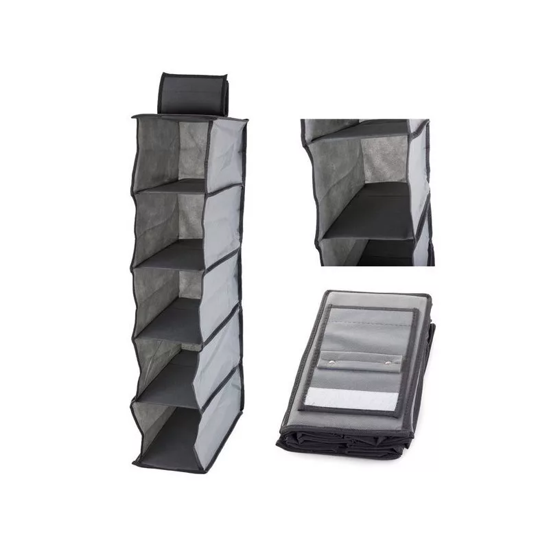 Ez a ruhásszekrény szervező függő polc 5 polccal 30x15x70cm hatékonyan helyet takarít meg a ruhásszekrényedben. Az öt polc lehetővé teszi, hogy szabadon szegregálhasd a ruháidat, miközben kevés helyet foglal el. A szervező rendezetté teszi a ruháidat, tökéletesen megvédi a ruháidat és az ágyneműdet a por és más külső tényezők ellen. A magas minőségű anyagból készült, ami garancia a hosszú évekig tartó használatra.Tulajdonságok:Magas minőségű kivitelezésVelcro rögzítésHelyet takarít meg a ruhásszekrénybenRendezetté teszi a dolgokatIdeális cipőkhöz, csizmákhoz vagy papucsokhozLélegző anyagTartósNedvességállóKiváló a ruhák és tárgyak pormentes védelméreKönnyen tisztíthatóPolcok száma: 5Méretek: 30cm x 15cm x 70cmPolc méretek: 30cm x 15cm x 14cmSzín: szürkeMiért vedd meg ezt?