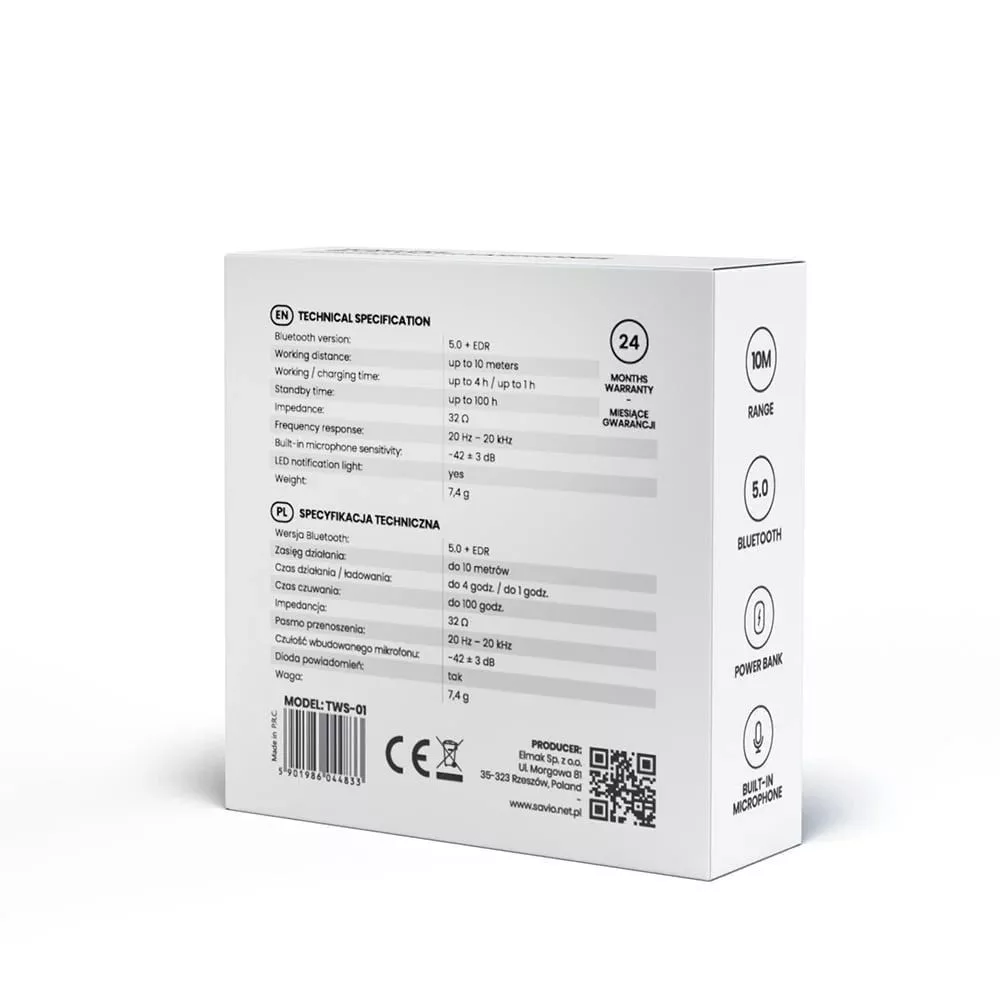 Savio TWS-01 Bluetooth Headset White