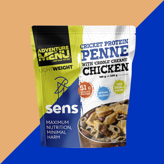 Az Adventure Menu és a SENS tücsökfehérje penne csirkével, kreol tejszínes mártásban tökéletes vésztartalékként vagy a következő szabadtéri kalandodhoz. Ez az étel órákra elegendő energiát biztosít, így bármilyen kihívásnak eleget tehetsz.