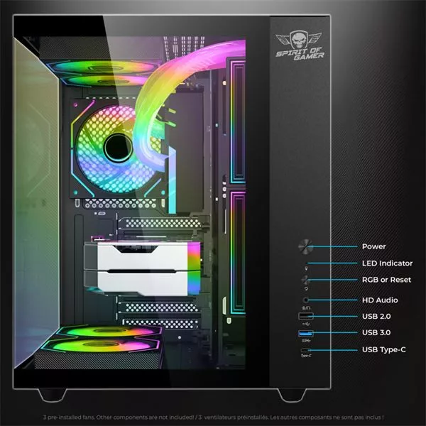 ATX, Black, 1x3,5", 2x2,5", 1xUSB2.0, 1xUSB3.0, 1xUSB Type-C, Audio, Táp nélkül, 416x407x354mm, Ventilátor:3x12cm, Tempered glass window, RGB, Gamer