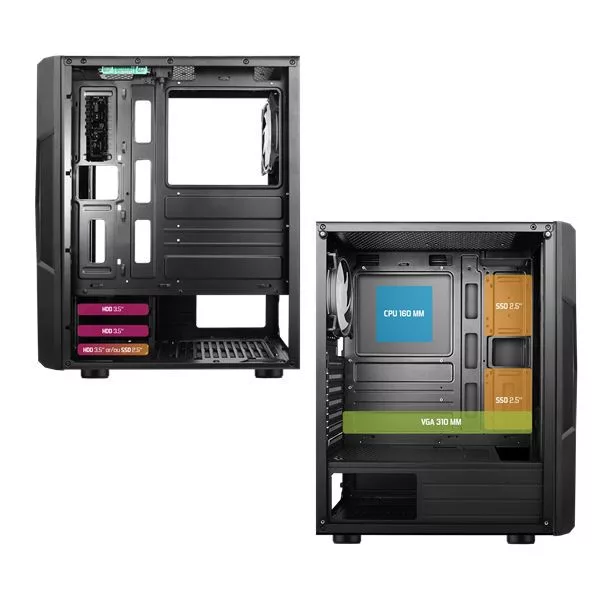 ATX, Black, 3x3,5", 3x2,5", 2xUSB2.0, 1xUSB3.0, Audio, Táp nélkül, 330x208x430mm, Window, RGB, Gamer
