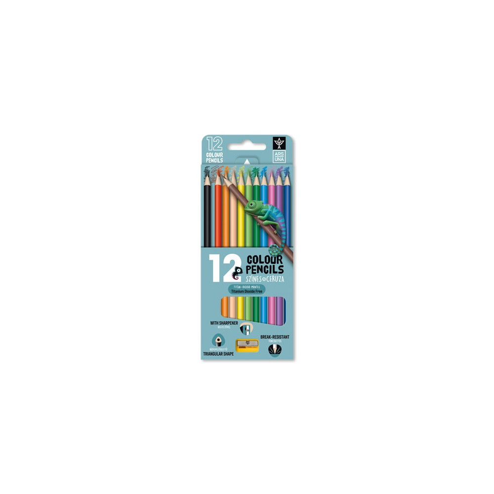 Prémium minőségű ARS UNA színes ceruza készlet hegyezővel. Kényelmes, háromszögletű kialakítás, 12 ragyogó, élénk szín, törésbiztos heg