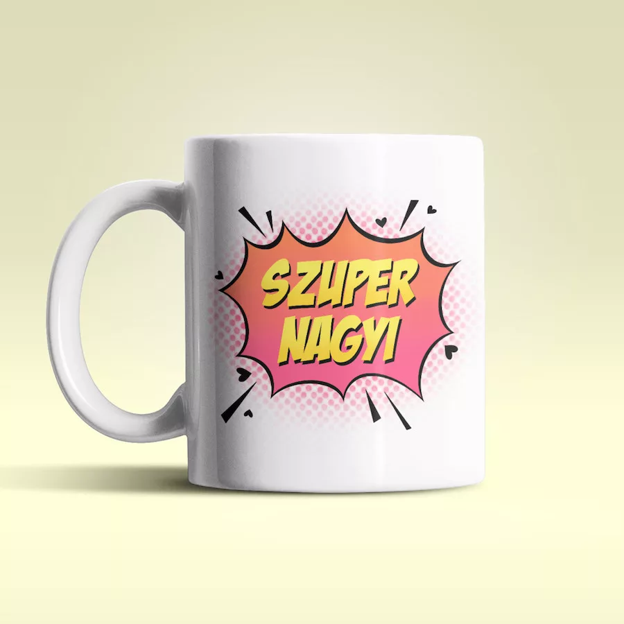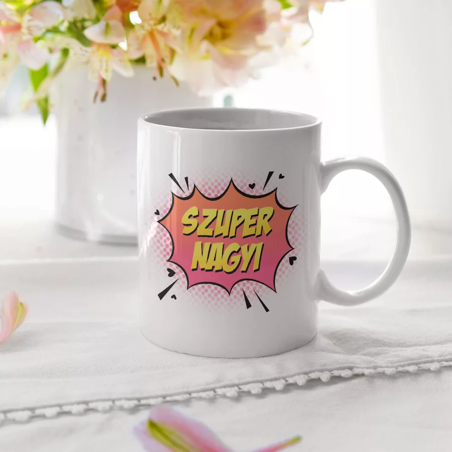 Szuper Nagyi fehér bögre.Bemutatjuk nektek a saját gyártású bögréinket!Rengeteg egyedi minta közül választhatod ki azt, amelyik a legjobban illik hozzád, vagy ahhoz a személyhez, akit meg szeretnél ajándékozni!De tényleg! Annyira sok ötletünk van, hogy bátran állítjuk azt, hogy biztosan megtalálod a tökéletes képpel és szöveggel ellátott bögrét!A kerámia bögrék 300 ml űrtartalommal rendelkeznek, mosogatógépben is moshatók, ráadásul mikrózhatók is! Sőt az egyik legjobb dolog bennük az, hogy két oldali nyomattal láttuk el őket, így a bögre mindkét oldalán láthatod majd a mintát!Csak tudj majd választani közülük! De ér egyszerre többfélére is beruházni! Hisz tudjuk jól, hogy bögréből sosem elég!Minőségi kivitelezés, dizájnos megjelenés jellemezi az összes egyedi tárgyunkat!Űrtartalom: 300 mlAnyag: KerámiaMosogatógépben moshatóMikrózhatóKét oldali nyomat. A nyomat a bögre mindkét oldalán látható.