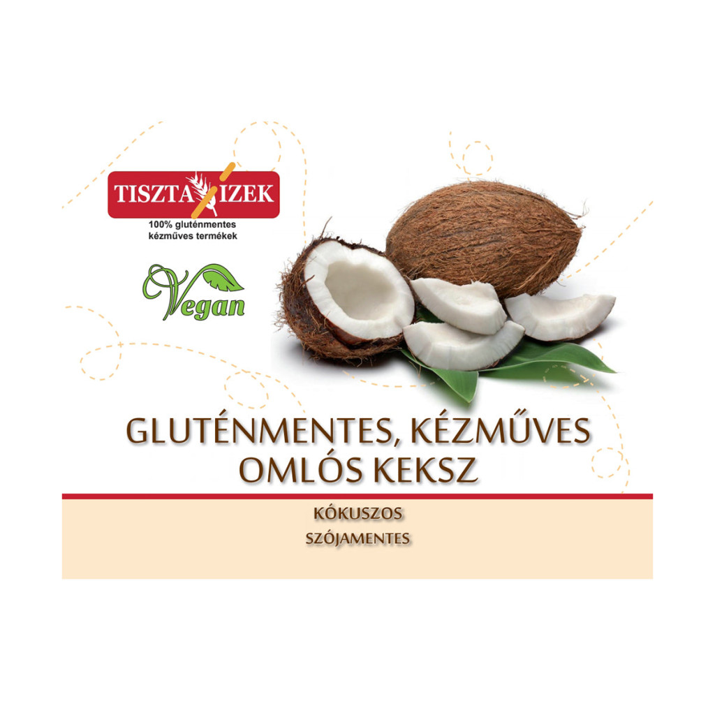 Gluténmenetes, kézműves kókuszos omlós keksz, édesítőszerrelÖsszetevők: kölesliszt, növényi olaj ( kókusz ), édesítőszer ( eritrit ), szárított kókuszreszelék 1,3%, tápiókaliszt, víz, ütifűmag héj,Átlagos tápérték 100g termékben:Energia: 2273kJ/544kcal, Zsír: 28g, amelyből telített zsírsavak: 25g, Sténhidrát: 56g, amelyből cukrok: 0,8g, Fehérje: 3,7g, Só: 0,01g