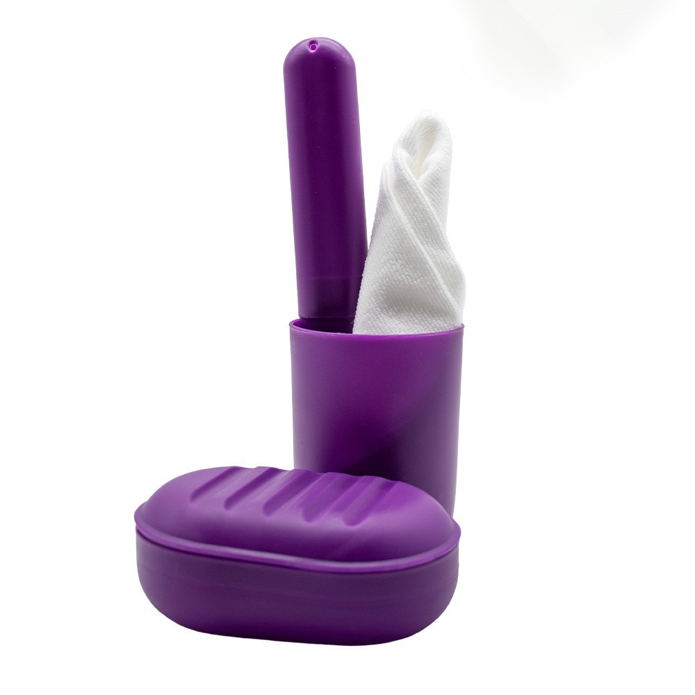 Tisztasági csomag összehúzható, zsinóros átlátszó zsákban. Tartalma: műanyag pohár, szappantartó, fogkefetartó, kéztörlő.