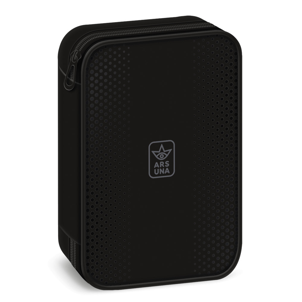 Többszintes, töltetlen, cipzáras tolltartó. Belül textillel bevont merev lapokkal, gumis kialakítással 30 ceruza számára az írószerek tárolásához és egy cipzáras belső zsebbel.