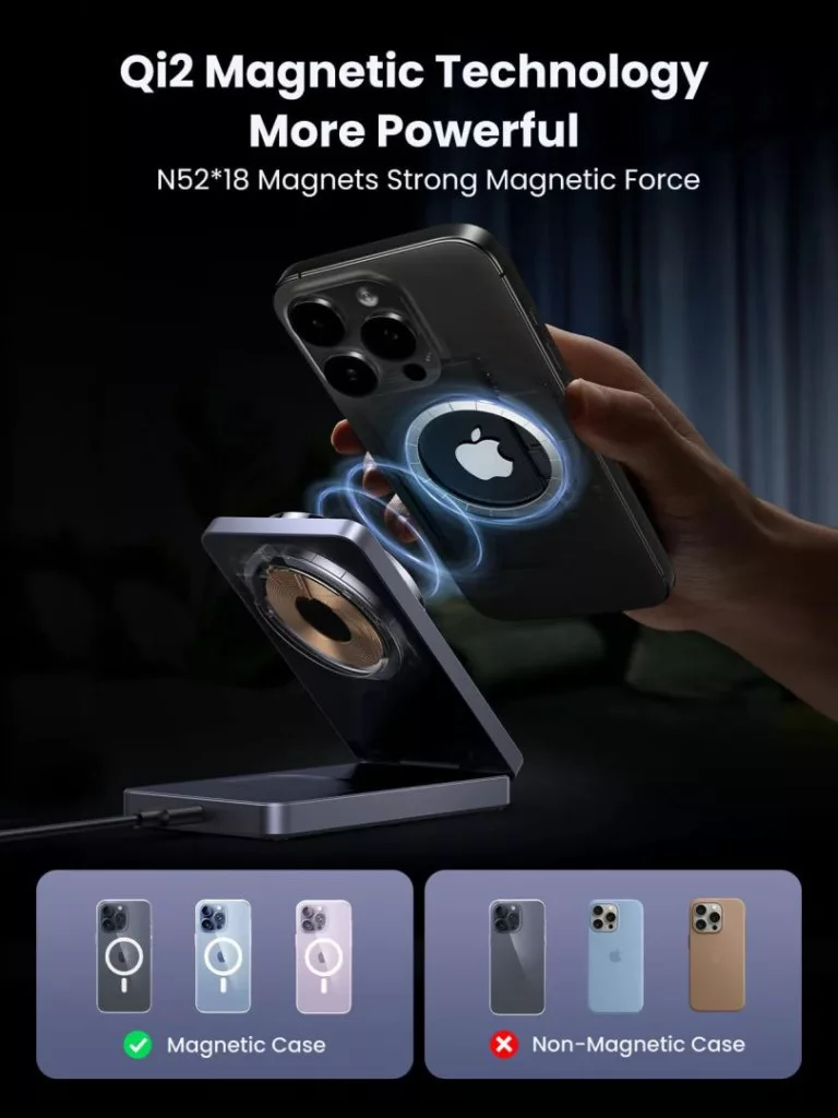 Univerzális kompatibilitás: iPhone 12-től 16-ig, AirPods, Galaxy Buds és Qi-kompatibilis eszközökkel együttműködik. Mágneses tartóval vagy tok nélküli telefonnal a legjobb eredményért.