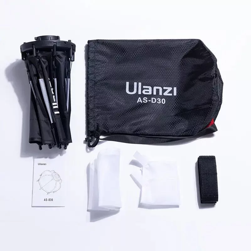 Az Ulanzi AS-D30 30 cm-es softboxot portré- vagy termékfotózáshoz tervezték, használható Speedlite vakuval, stúdióvakuval vagy Speedlight ernyősoftboxként. A softbox könnyedén használható, kinyitható és összecsukható, kompakt méretekkel rendelkezik. A Mini Bowens rögzítés kompatibilis az Ulanzi LT028 40W és LT005 60W lámpákkal.