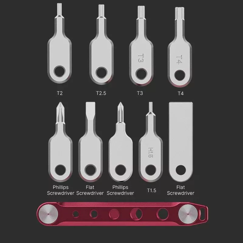 9 az 1-ben Csavarhúzó Készlet, mely tartalmaz 2 lapos csavarhúzó fejet és 7 csillag csavarhúzó fejet, 1.5, 2, 2.5, 3, 4 mm-es méretben, illetve két Philips csavarhúzó fejet.