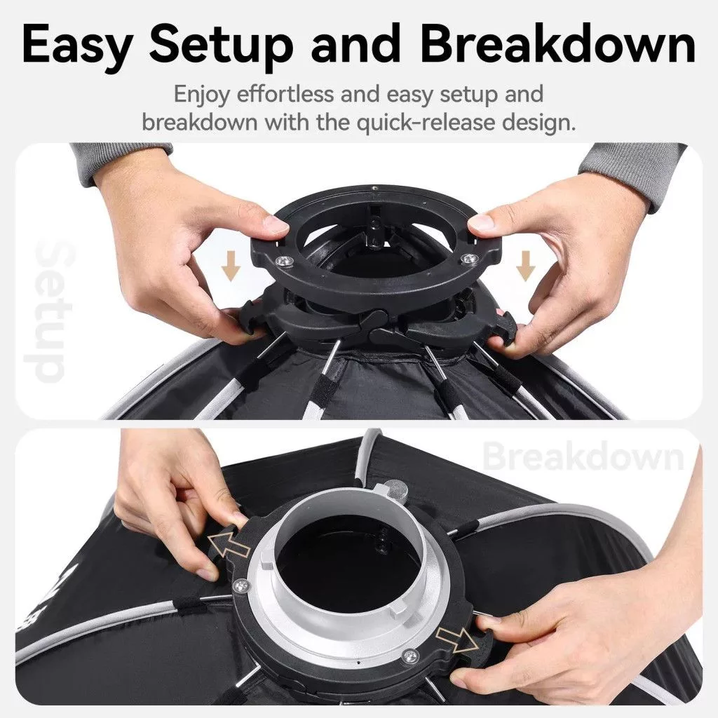 Az Ulanzi L067 Nyolcszögletű Softbox egy professzionális fényformáló eszköz, amely a Bowens mount rendszernek köszönhetően széles körű kompatibilitást kínál. A nyolcszögletű forma lehetővé teszi a fény szélesebb és egyenletesebb eloszlását, amely ideális a lágy, természetes megvilágításhoz.
