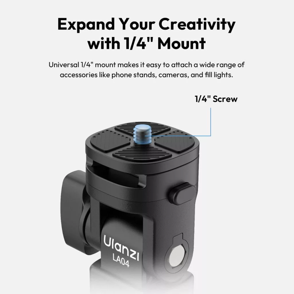 Az Ulanzi LA04 segítségével felszerelésed mindenféle állványhoz vagy pálcára könnyen csatlakoztatható - legyen szó LED lámpáról, mikrofonról vagy vakuról. Strapabíró, kompakt és egyszerűen használható kialakítása révén ideális mindennapi, utazás közbeni vagy stúdióhasználatra. A vakupapucs és az 1/4" menetes csatlakozás kombinációja maximális rugalmasságot biztosít minden fotós és videós helyzethez.