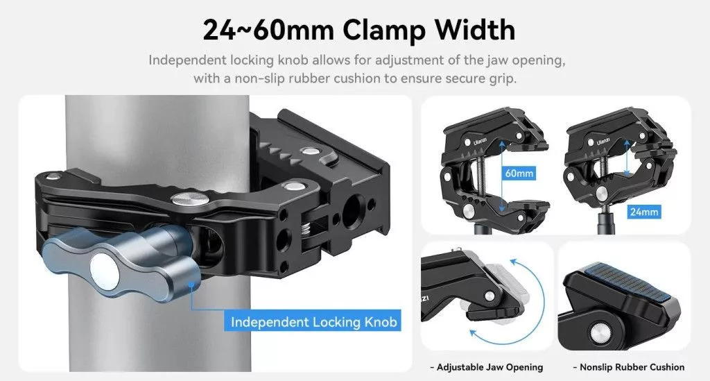 Az Ulanzi R011A Crab Clamp T003 egy sokoldalú és erős rögzítőkapocs, amely különböző felszerelések, például kamerák, lámpák, mikrofonok és egyéb kiegészítők stabil rögzítésére szolgál.