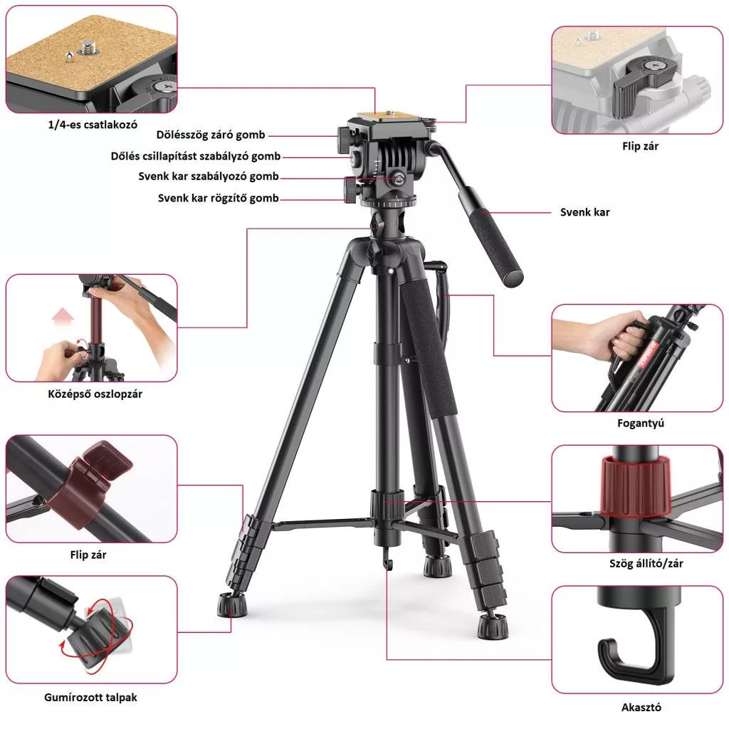 A 4 részből álló alumíniumötvözet háromlábú flip-zárral meghosszabbítja a magasságot 58,5 cm-ről 183 cm-re; A 62 cm-es összehajtható méretnek köszönhetően bárhová könnyen magával viheti.