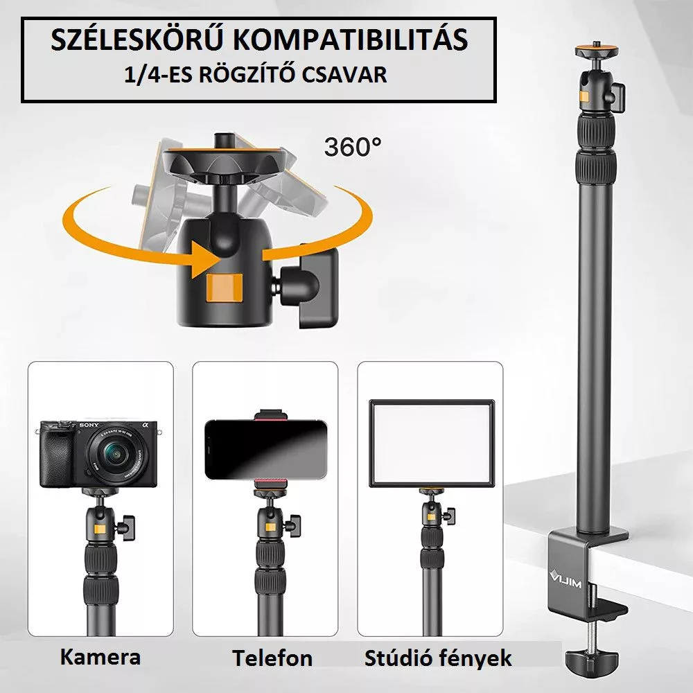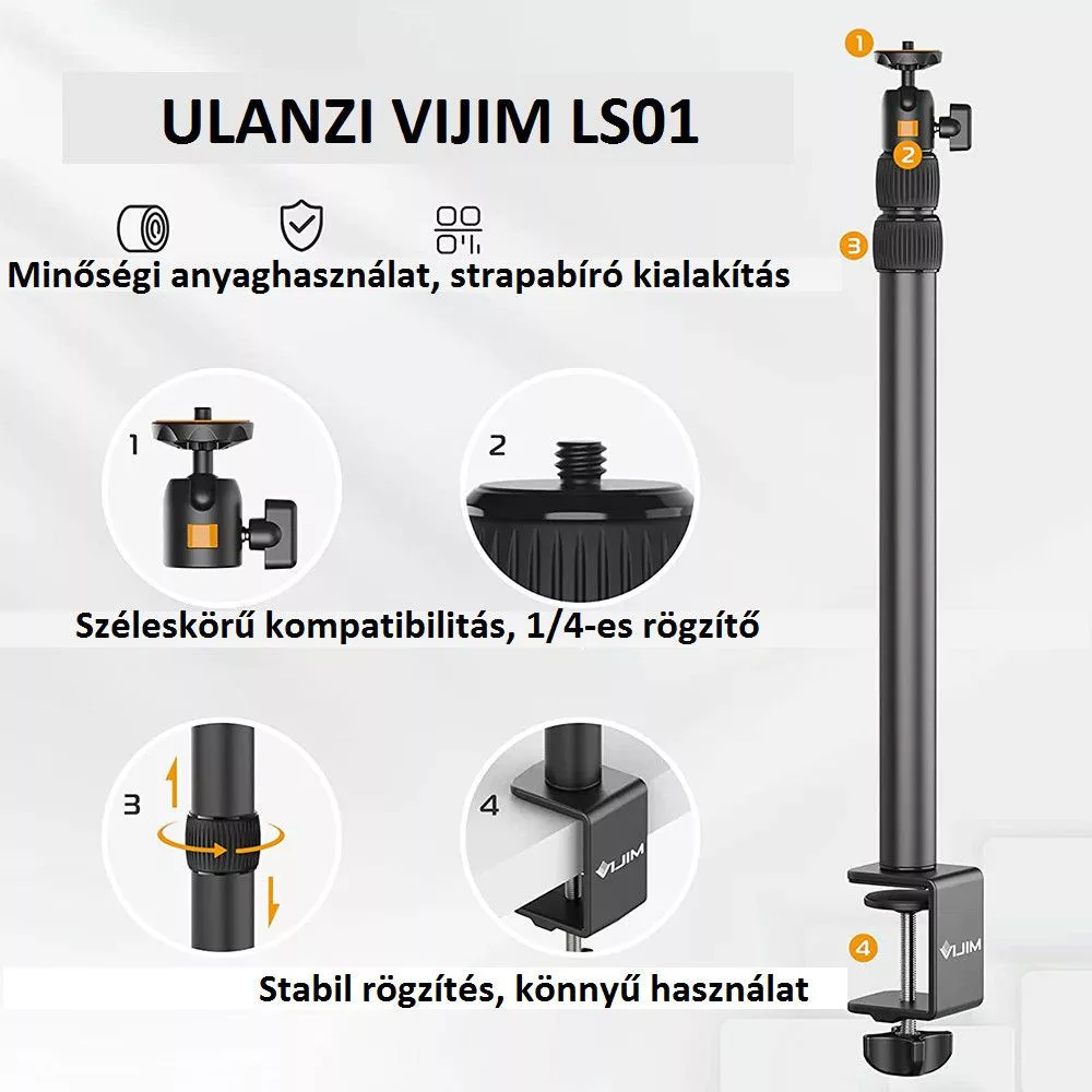 Az Ulanzi Vijim LS01 multifunkciós, állítható asztali állvány rendszer rendelkezik szabványos 1/4-es csavarral, így kompatibilis a legtöbb kamerával, lámpával és egyéb, 1/4"-os adapterrel rendelkező kiegészítővel.