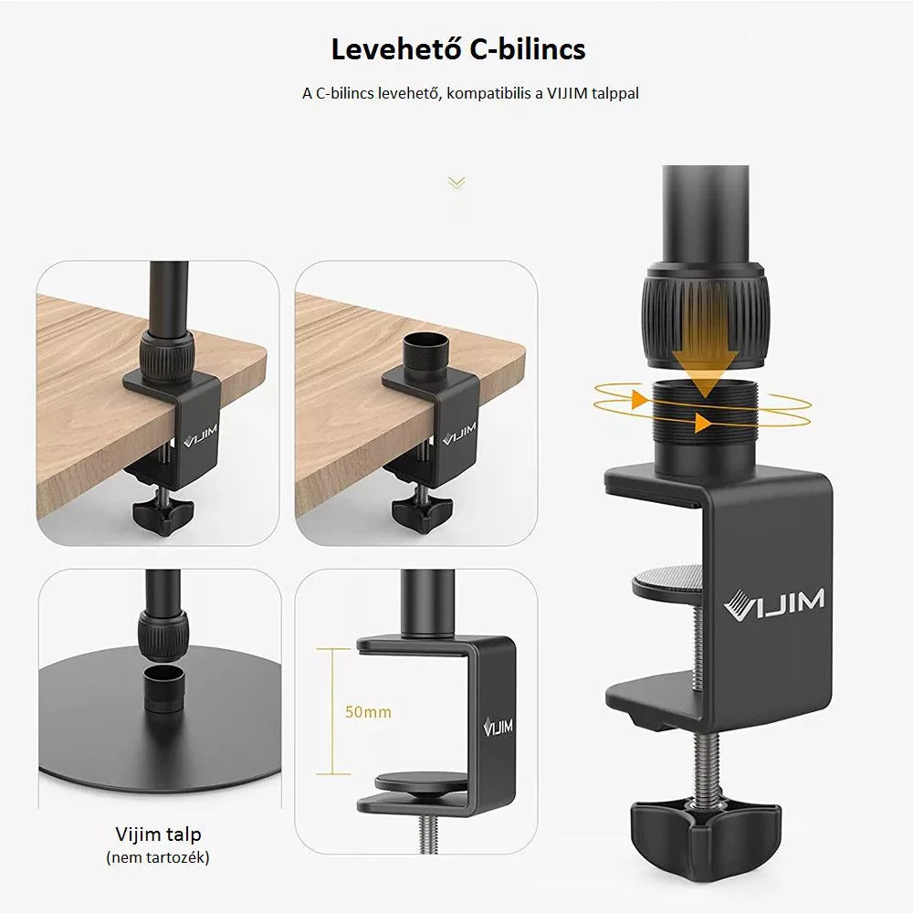 Stabil párnázott C-rögzítő: A C-rögzítő leválasztható, és a főoszlopot rá lehet helyezni a VIJIM masszív talapzatra. A C-rögzítő 5 centiméterig kinyitható, kompatibilis a piacon kapható legtöbb íróasztallal, és maximális stabilitást biztosít. Maximális terhelhetőség: 3 kg.