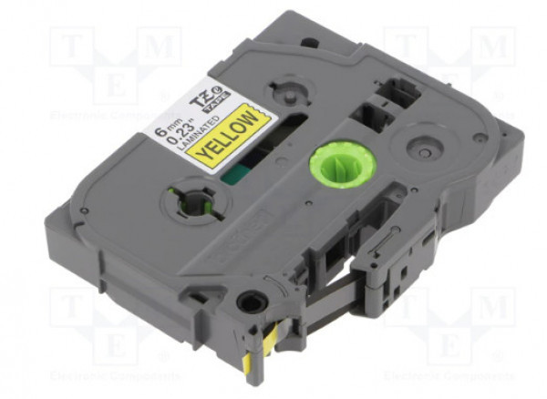 6 mm széles, 8 m hosszú, sárga alapon fekete betűs, öntapadós címkeszalag laminált tartós feliratok nyomtatásához.