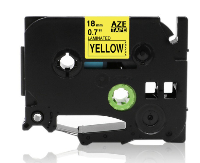 18 mm széles, 8 m hosszú, sárga alapon fekete betűs, öntapadós címkeszalag laminált tartós feliratok nyomtatásához.