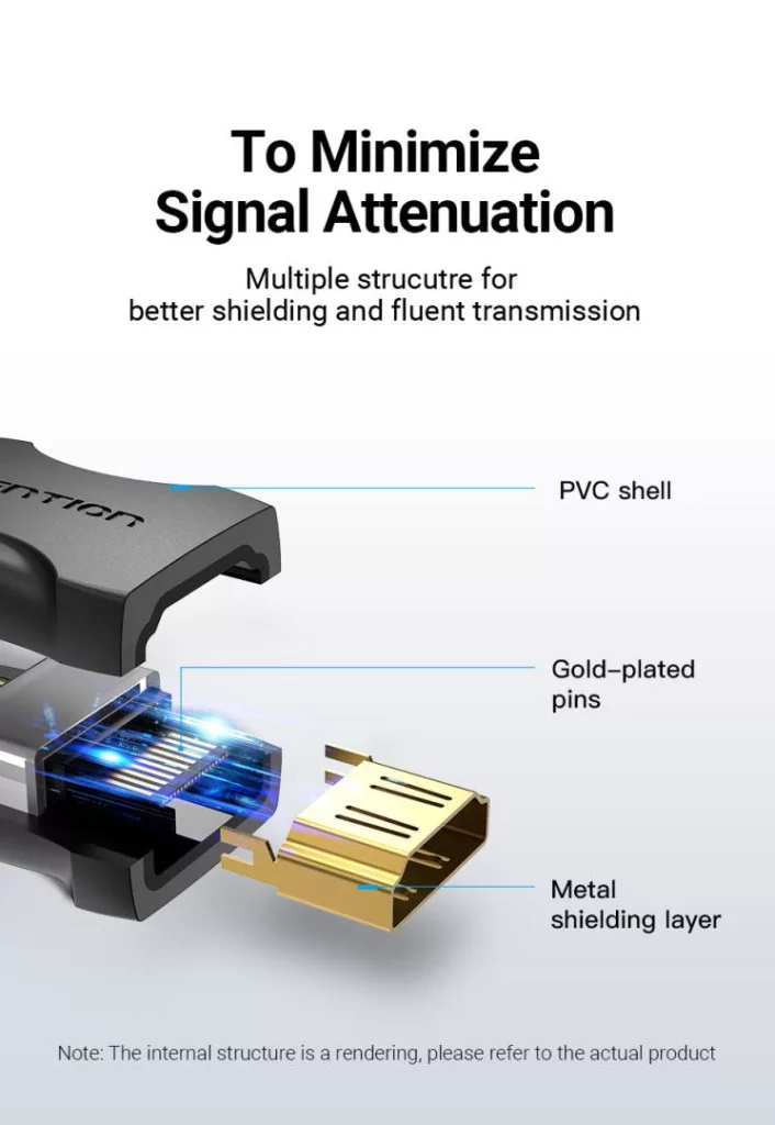 Minimális jelcsillapítás: A Vention HDMI csatoló PVC-héjjal, fém árnyékoló réteggel és aranyozott csapokkal készült a jelveszteség és a csillapítás minimalizálása érdekében. Ez a fejlett kialakítás garantálja a gördülékeny és következetes átvitelt, megőrizve az audio- és videojelek integritását nagyobb távolságokon keresztül.
