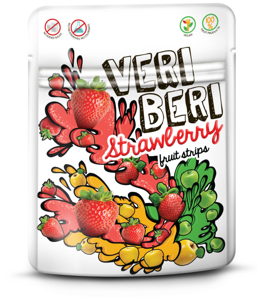 Veri Beri eper gyümölcscsíkok 100%-ban különféle gyümölcstermékekből. Nem tartalmaz hozzáadott cukrot, tartósítószert, színezéket. Gluténmentes, rostforrás. Összetevők: almapüré-sűrítmény, almalé-sűrítmény, eperlé-sűrítmény (5%), zselésítőanyag - citruspektin, citrusrost, citromlé-sűrítmény, természetes aroma. Átlagos tápérték/100 g : Energia: 327 kCal/1374 kj, Zsír : 0,31 g, amelyből telített zsírsavak: 0g; Szénhidrát: 78,15g, amelyből *cukrok: 66,16g; Rost: 8,94 g; Fehérje: 1,47 g; Só: 0,02 g. *Természetes módon előforduló cukrokat tartalmaz. Nettó tömeg: 50g. Minőségét megőrzi ( nap/hó/év): Lásd a tasak hátulján.