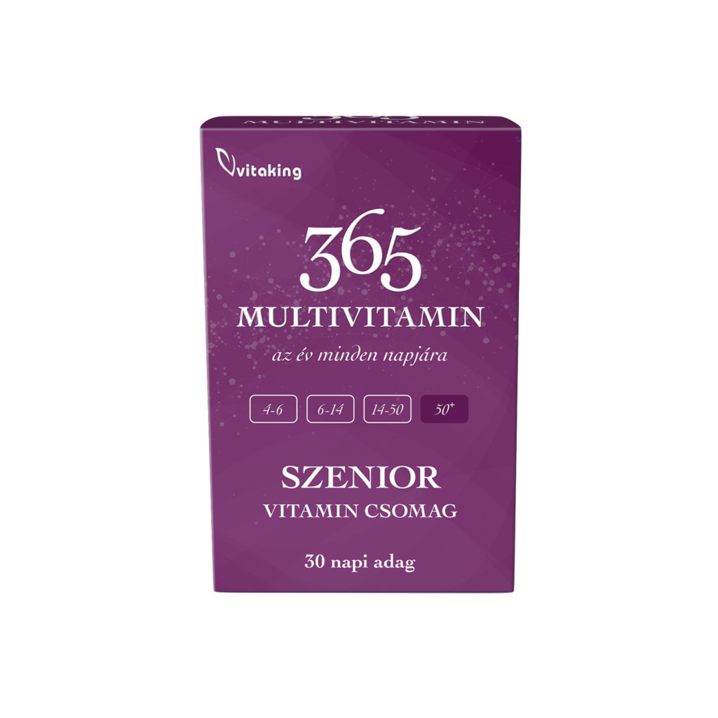 A korábban Multi Profi Senior néven ismert vitamincsomag mostantól 365 Multivitamin Szenior néven érhető el. Az új változat nem csupán külsőleg kapott frissítést, hanem továbbfejlesztett összetétellel is rendelkezik, hogy egész évben még optimálisabb támogatást nyújtson a szervezet számára. A megszokott magas minőségű vitamin- és ásványianyag-tartalom mellett most már K2-vitaminnal is kiegészült, amely hozzájárul a csontok normál állapotának fenntartásához.Az új formulában kiváló, szerves ásványi anyagok és nyomelemek találhatóak, köztük magnézium-biszglicinát, cink-citrát, kálium-citrát, króm-pikolinát, réz-glükonát és vas-fumarát. Az ásványi anyagokon és vitaminokon túlmenően a formula változatlanul tartalmazza az 50 év felettiek számára fontos összetevőket, mint az Omega-3 zsírsavak, Q10 koenzim, ginkgo biloba és fokhagyma kivonat.Ahogy az életkor előrehalad, a szervezet tápanyagszükséglete is átalakul, ezért érdemes célzottan az 50 év feletti korosztály számára fejlesztett multivitaminokat választani. A 365 Multivitamin Szenior napi adagja átfogó tápanyagellátást biztosít, amely támogatja az idősebb szervezet igényeit.Minden napi multivitamin csomag tartalmazza az alábbi 7 féle készítményt:1 db B1-vitamin kapszula,1 db Mega B-50 tabletta,1 db 1000 mg-os C-vitamin tabletta,1 db A+D+E+K2+ Szelén kapszula,2 db Ásványi-anyag és nyomelem komplex,1db Ginkgo Biloba Forte 120mg kapszula,1 db Cardiolic kapszula (Q10, Omega-3, Fokhagyma és L-karnitin).
