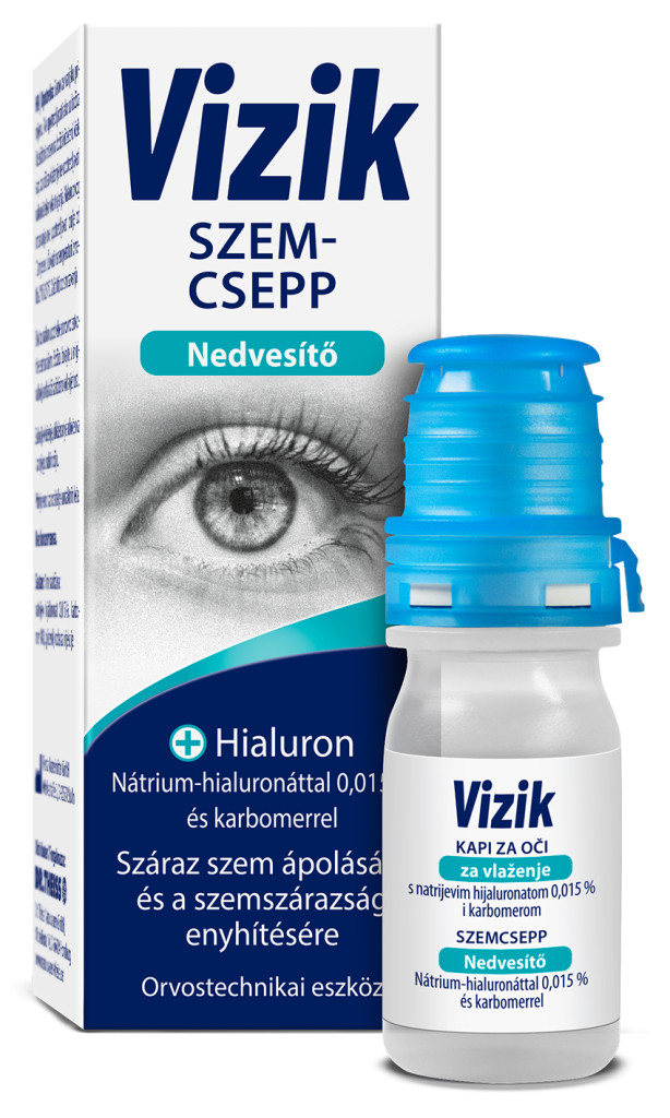 A VIZIK Nedvesítő szemcsepp egy steril, tartósítószer-mentes, viszkoelasztikus és átlátszó védőfilmet képez a szaruhártyán. Ezt főleg a nátrium-hialuronát, a hialuronsav nátriumsója biztosítja, mely különleges fizikai tulajdonsága miatt egy egyenletes, stabil és különösen hosszantartóan tapadó védőfilmet képez a szaruhártyán, anélkül hogy a vizuális teljesítményt befolyásolná. A szaru és kötőhártyán lévő sikosító- és védőfilm-képződés támogatására a termék karbomert is tartalmaz. A hialuronsavval együtt ez ideálisan kompenzálja a hiányzó könnyfolyadékot. Ezáltal hosszantartó enyhülést eredményez olyan panaszok esetén, mint