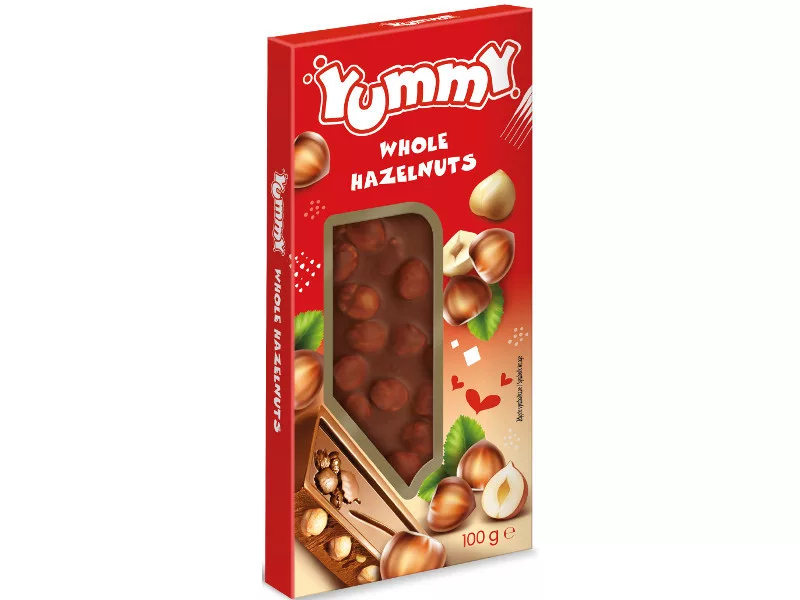 A Yummy 100 g Egészmogyorós kakaós tejtábla egy semleges hangvételű desszertválasztás a mindennapokra. A kakaós tejcsokoládé gazdag íze és a praktikus, 100 g-os kiszerelés könnyen kezelhetővé teszi a terméket.