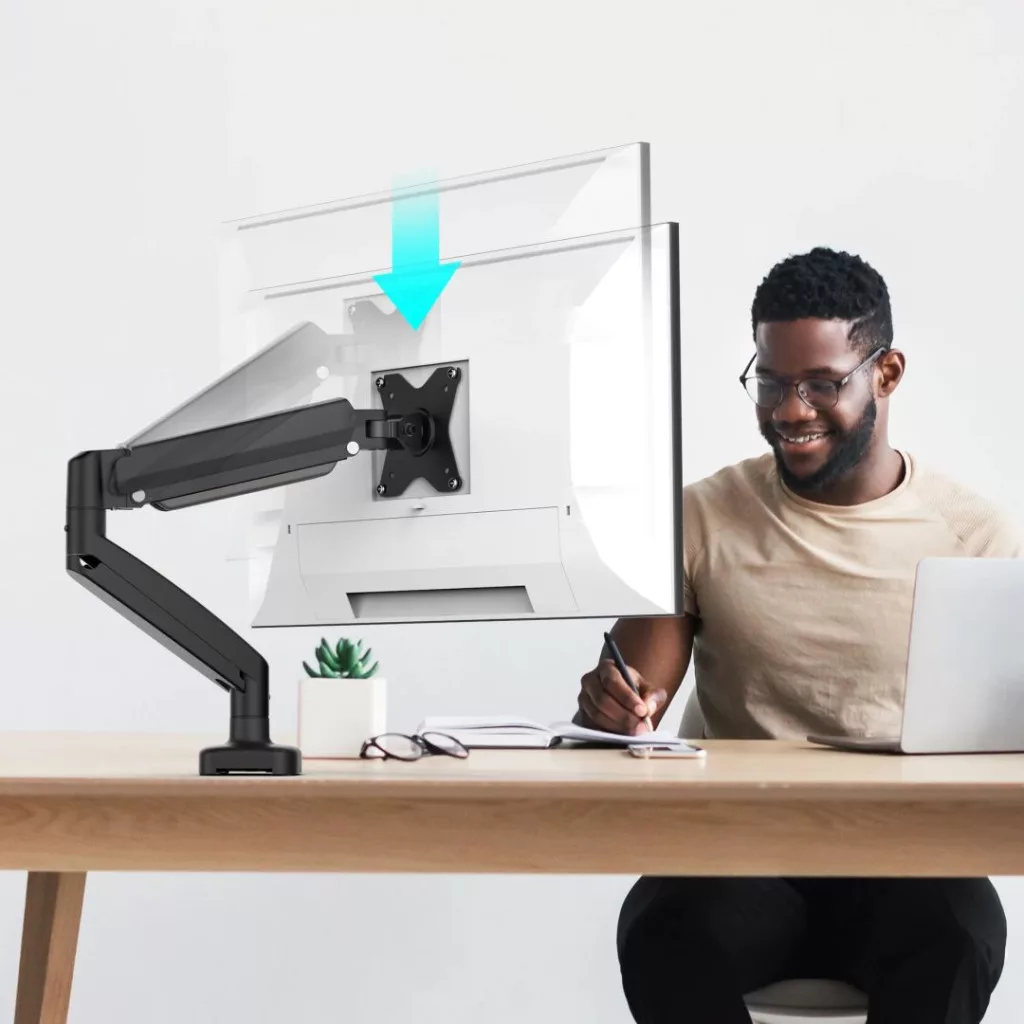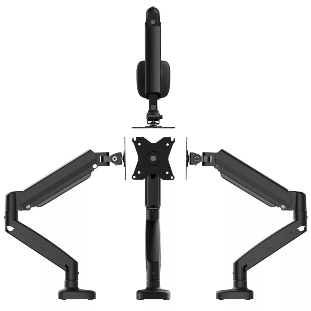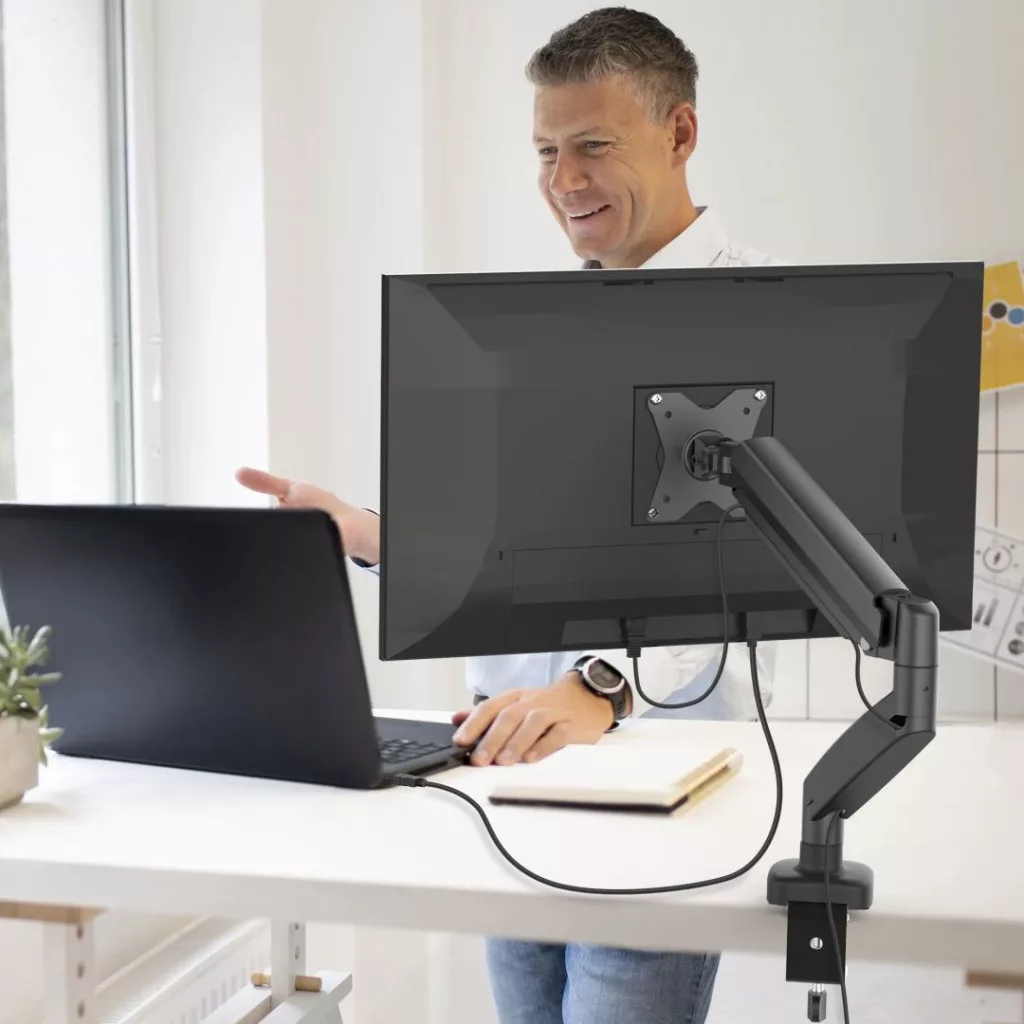 A JTSA101 egy gázrugós monitortartó. A kar max. 32"-os képernyőt tud tartani, amelynek súlya legfeljebb 8 kg/17,6 font. Könnyedén beállíthatja a képernyőt bármilyen magasságra. A gázrugó lehetővé teszi a képernyő 180°-os elforgatását, -45°-tól +90°-ig történő dőlését és 360°-os elforgatását. Kényelmesen állítsa be a monitort az optimális szögben. Ez a monitortartó lehetővé teszi, hogy hatékonyabb munkaterületet hozzon létre, akár extra helyre van szüksége, akár állóasztal-beállításra.