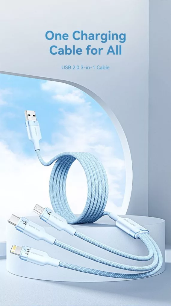 Az USB 2.0 A - 3in1 3A Vention CTPLG 1,5M kábel egy sokoldalú megoldás, amely lehetővé teszi, hogy különböző eszközöket töltsön és szinkronizáljon egyetlen kábellel. Három különböző csatlakozóval - Lightning, USB-C és Micro-B - felszerelve tökéletes lesz a modern okostelefonok, valamint a régebbi eszközök, például powerbanks és fényképezőgépek töltésére.