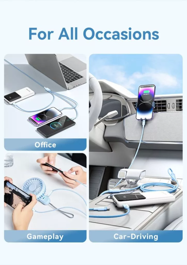 A Lightning USB-C és Micro-B csatlakozókkal a kábel az eszközök széles skálájával kompatibilis. Támogatja az Apple, a Samsung, a Xiaomi, az OPPO, a vivo és sok más gyártó okostelefonjait, valamint az alacsonyabb energiafogyasztású tartozékokat, például a Bluetooth fejhallgatókat, USB ventilátorokat vagy játékvezérlőket. Ideális azok számára, akik értékelik a kényelmet és a rendet - egy kábel több másikat is helyettesít.