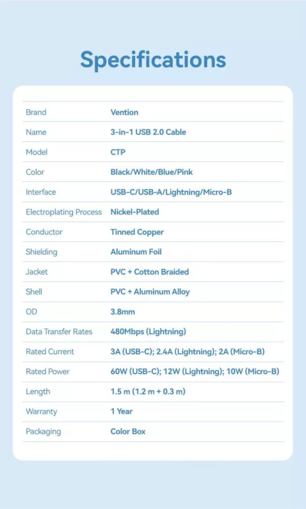 A Vention CTPLG kábel akár 3A maximális töltőáramot biztosít (60W USB-C esetén, 12W Lightning és 10W Micro-B esetén) az eszközök gyors és biztonságos töltéséhez. Az akár 480 Mbps adatátviteli sebesség lehetővé teszi a fájlok, például fényképek, zenék vagy dokumentumok pillanatok alatt történő átvitelét, így a kábel nemcsak kényelmes, hanem hatékony eszköz a mindennapi használatban is.