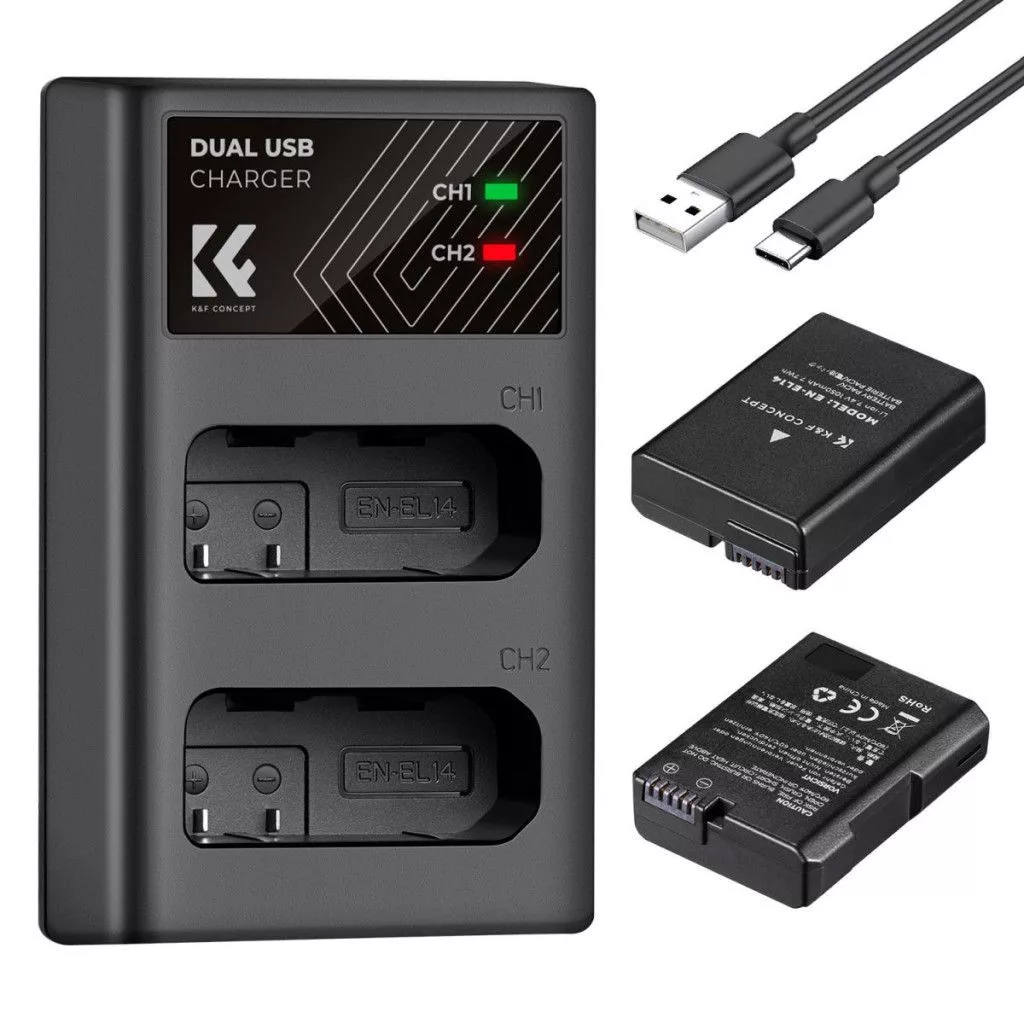 Erőteljes Akkumulátor Kapacitás: A K&F CONCEPT EN-EL14 akkumulátor töltő szett Nikon EN-EL14 akkumulátorokhoz, két 1050mAh kapacitású újratölthető akkumulátorral és USB dupla slotos töltővel.