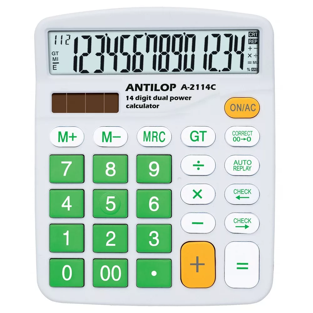 Antilop A-2114C színes asztali számológép 14 számjegyű nagy kijelző, memória funkció, GT, műveletek közötti előre és vissza léptetés, auto replay, 00 javítás 0-ra, és alapműveletek.Működési mód: ceruzaelem+napelem. Méret: 145 x 120 x 40 mm. Katalóguskód: 1706