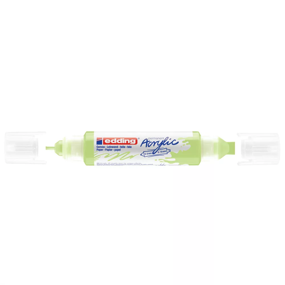 Kétoldalú edding 3D akril tubus egyedi effektusokhoz és sötét és világos felületekre történő festéshez, ideális olyan anyagokhoz, mint a vászon vagy a festőpapír. - A kétoldalú tubus két különböző írócsúccsal rendelkezik 2 - 3 mm és 5 - 10 mm vonalvastagságban. - A kiváló minőségű, pigmentált, vízbázisú akrilfesték száradás után rendkívül tartós, átlátszatlan, fényálló és szagtalan. - A neon sárga szín áttetsző.- 26 féle színválasztékban elérhetők- Keresse a további változatokat - edding 5000 és az edding 5100-at, valamint az edding 5300-as akril markereket. Katalóguskód: 36531